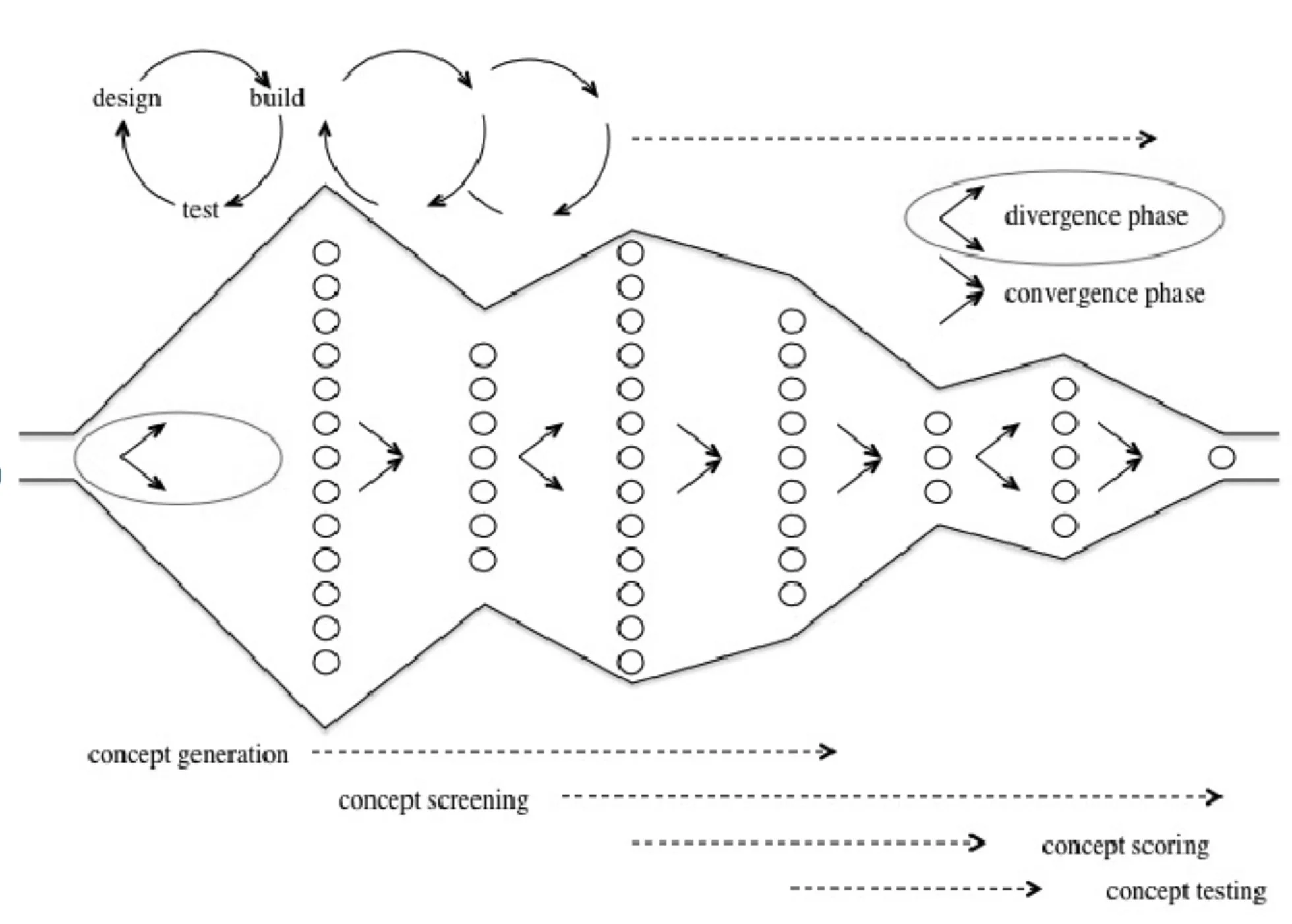 The classic, textbook diagram above illustrates this as cycles of divergence and convergence. At first, the goal is to generate as many ideas as possible—sketches, concepts, approaches. This is the divergence phase, where creativity flows without judgment. Then comes the convergence phase, where ideas are tested, compared, and pared down to the few that have the most potential.
